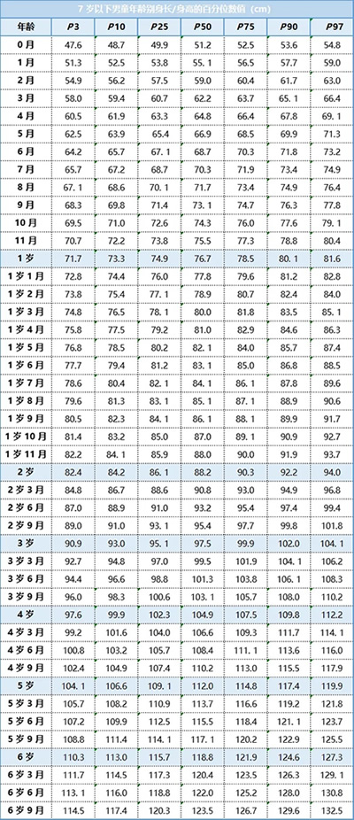 7歲以下男童年齡別身長/身高的百分位數(shù)值