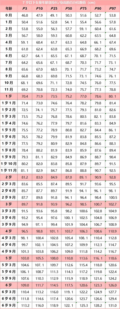7歲以下女童年齡別身長/身高的百分位數(shù)值